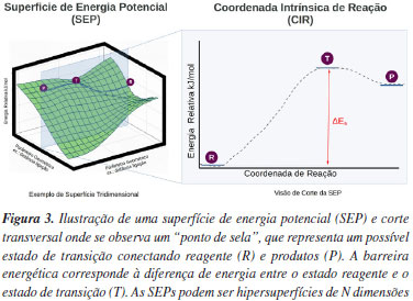Diretamente, não existe uma formulação da TET na mecânica quântica devido à incerteza da trajetória e momento, como prevê a incerteza descrita por Werner Heisenberg. Antes, o uso da mecânica quântica com TET está em sua acurácia e precisão para calcular entalpia ΔH#0, entropia ΔS#0 e energia de Gibbs ΔG#0, quantidades termodinâmicas que são utilizadas para calcular constantes de acordo com a TET.31 Qualitativamente, embora os coeficientes de partição translacionais, rotacionais e vibracionais não estejam explícitos na Equação 9, cálculos ab initio e de DFT podem ser consideravelmente exatos para prever informações termodinâmicas/energéticas sobre esses modos e, por isso, são usados comumente para aplicar a TET a sistemas de foram teórica. Embora dados termodinâmicos absolutos não possam ser derivados com precisão por este modelo, o uso da QQC permite modelar barreiras energéticas relativas entre reagentes, estado de transição e produtos, bem como a coordenada intrínseca de reação (CIR). A Figura 3 apresenta um gráfico de exemplo de corte transversal da SEP e mostra o "caminho" de reagentes para produtos passando pelo estado de transição, como pressuposto na TET. Assim, é possível comparar diferentes reações e estruturas do estado de transição de forma relativa, especialmente para reações de dissociação do tipo AB+ → A + B+, como ocorre em fragmentação CID.