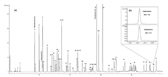 ![]() Figura 1. Representa em (a) cromatograma de íons totais da solução analítica 25 μg L-1 preparada no extrato "branco" da matriz contendo os 48 compostos avaliados neste estudo. Em (b) observa-se a alta especificidade do modo de aquisição SRM empregado no MS/MS, destacando os picos obtidos nas duas transições