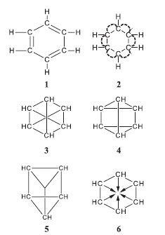 ![]() Figura 1. Fórmulas estruturais do benzeno apresentadas em Noções elementares de Chimica Organica, de Tibúrcio Valeriano Pecegueiro do Amaral (p. 86-87): (1) Kekulé; (2) Thiéle; (3) e (4) Claus; (5) Landenburg; (6) Armstrong e Bayer