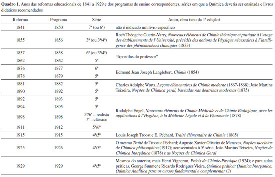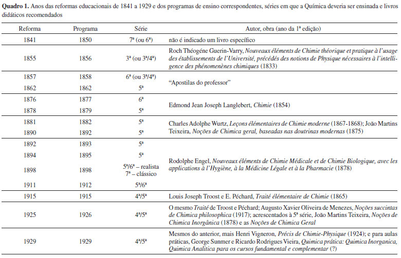 Analisando o Quadro 1, observa-se que a Química foi ensinada principalmente na 5ª série do secundário, em alguns anos aparecendo anterior ou posteriormente nos currículos. São indicadas nos programas dez obras, seis francesas e quatro brasileiras - estas a partir de 1881, mas sempre acompanhadas de uma ou mais francesas. De fato, as autoridades visavam dar organicidade e modernidade ao secundário brasileiro inspirando-se nos liceus europeus, e as reformas de 1855, 1862 e 1889 demonstram que as mudanças educacionais no Brasil andavam pari passu com o que ocorria na França.27 Outro aspecto é que muitos dos livros foram concebidos para as escolas superiores, mas assim mesmo eram indicados para o ensino secundário. Os registros na literatura acadêmica, sobre estes textos, vêm coligindo informações coerentes, com poucas divergências. Mortimer,28 analisando dez livros brasileiros do período que vai do início do século XIX a 1930, assim resume as características destas obras: