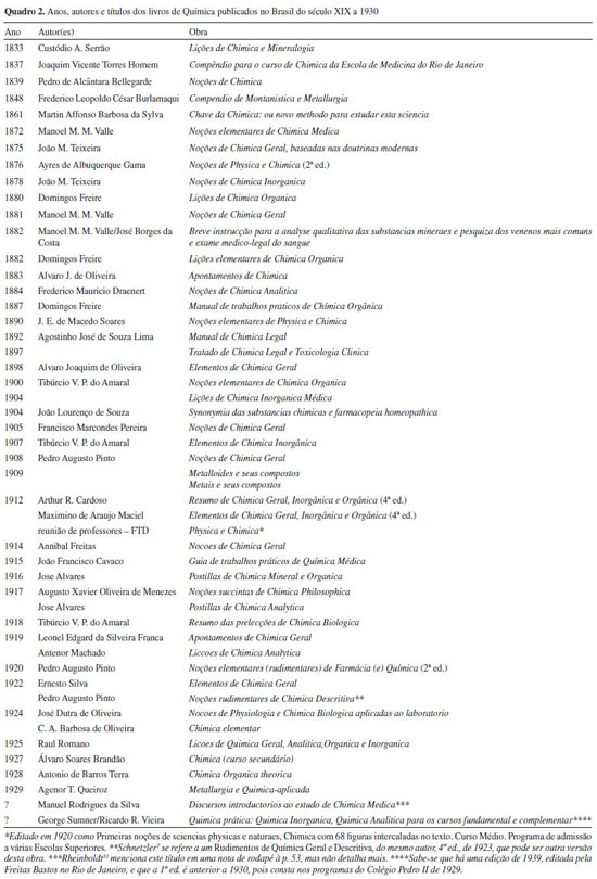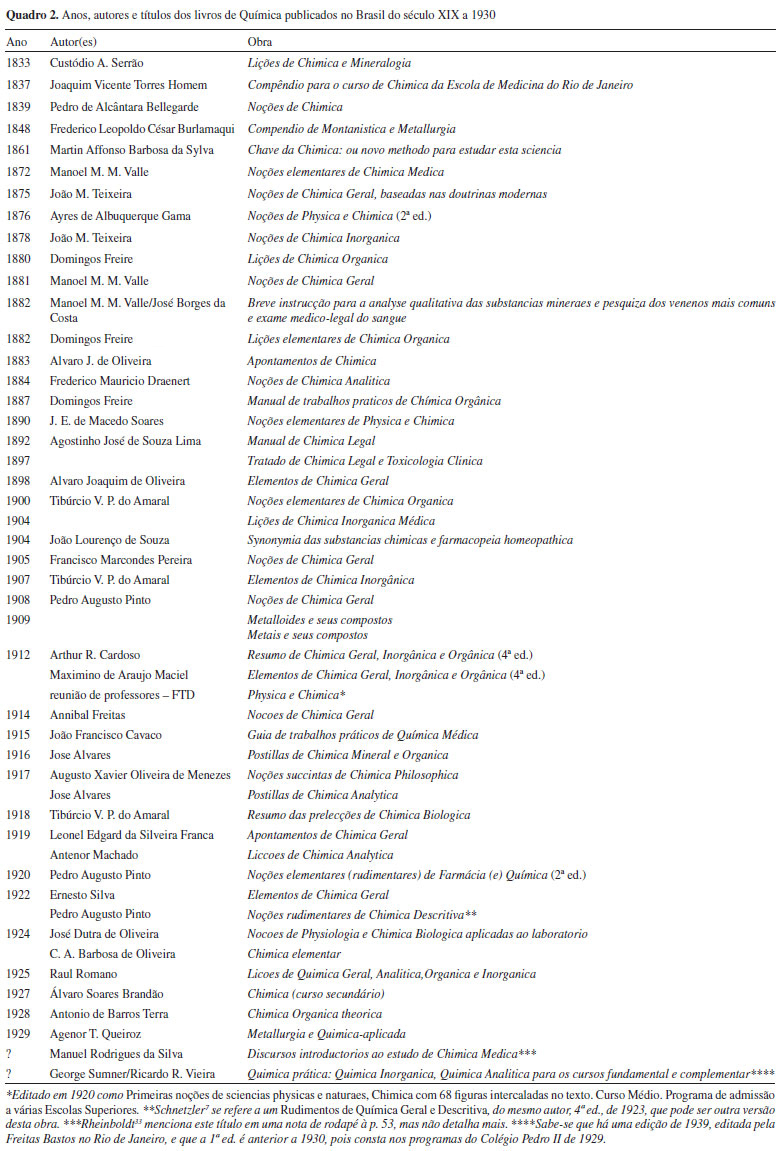 COMENTÁRIOS FINAIS Os livros brasileiros para o ensino de Química, do século XIX à década de 1930, constituem uma fonte de interesse para a historiografia das ideias químicas no Brasil, da educação e mesmo da filosofia brasileira (vide, por exemplo, o aspecto positivista do livro Apontamentos de Chimica). Estas obras apresentam elementos nem sempre encontrados nos livros atuais, embora almejados pelos especialistas do campo da Educação em Ciências, como o tratamento dos conteúdos que enfatize sua compreensão, a organização lógica, fundamentada e coerente, e a abordagem crítica de questões da história e da filosofia da ciência. Embora os ensinos secundário e superior brasileiro de Química se baseassem inicialmente nos compêndios franceses, aos poucos passaram a recomendar e orientar-se por livros escritos por brasileiros e publicados em editoras como a Imprensa Nacional e a Francisco Alves, sempre em língua portuguesa. Com o passar das décadas esta produção foi se avolumando, estando preservada em inúmeros acervos pessoais a públicos, e disponível para o exame de historiadores, educadores e químicos. Como uma contribuição final deste artigo, compilamos no Quadro 2 todos os títulos reunidos pelos estudos dispersos que os tomaram como material de análise, já apresentados, além de outros que encontramos pesquisando em bibliotecas públicas do Estado de São Paulo. A listagem totaliza 50 livros didáticos diferentes. No quadro, os anos se referem à primeira edição das obras (e primeiro volume, quando for o caso), exceto quando indicado. Os nomes dos autores não foram abreviados, a não ser os já mencionados no corpo deste artigo e aqueles que não conseguimos obter. Finalmente, foram tomados em consideração apenas autores brasileiros (pesquisa posterior pode mostrar que alguns dos nomes são portugueses) e livros impressos no Brasil, o que explica a exclusão, por exemplo, do livro de Daniel Gardner (1810) e de Elementos de Chimica (1901) de Ruy Telles Palhinha, publicado em Paris. A exclusão de Nova nomenclatura química portuguesa, de João da Silveira Caldeira, se justifica pelo caráter do livro, mais uma obra de referência que um livro didático propriamente dito.