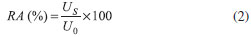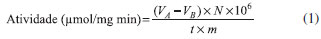 em que: m - massa seca de enzima livre ou imobilizada (pó) (mg); N - normalidade da solução de KOH (N); t - tempo de reação (min); VA - volume de KOH gasto na titulação da amostra (mL); VB - volume do KOH gasto na titulação do controle (mL) Recuperação de atividade A recuperação de atividade (RA%) foi calculada pela equação 2: