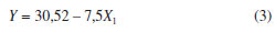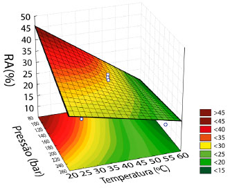 A variável pressão, como demonstrado na Figura 3, diferentemente da temperatura, não apresentou efeito significativo, confirmando os resultados apresentados na Tabela 2, que mesmo com seus níveis mais baixos no planejamento experimental obteve resultados distintos quando oberva-se a relação com a temperatura. A 100 bar e 25 ºC obteve-se 37,27% de RA e, nessa mesma pressão, à 55 ºC, foi observado um valor inferior de 15,54% (Tabela 1). A validade do modelo proposto verificada por meio da análise de variância (Tabela 3) constatou que a regressão obtida foi estatisticamente significativa (p < 0,01), apresentando um coeficiente de determinação (R2) de 0,77. Na região experimental testada o modelo é linear e o modelo estatístico determinado para a resposta estudada foi obtido por meio da regressão linear pelo método dos mínimos quadrados, sendo expresso pela equação (3):