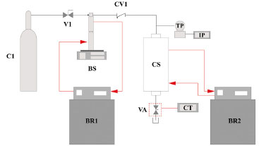 ![]() Figura 1. Aparato experimental utilizado para a consecução dos experimentos de secagem do sol-gel empregando CO2 pressurizado