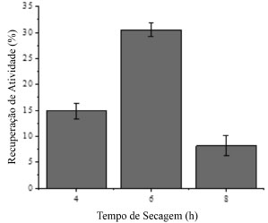 ![]() Figura 2. Recuperação de atividade hidrolítica (RA%) para a lipase BC empregando diferentes tempos de secagem do biocatalisador imobilizado por encapsulação pela técnica sol-gel em meio supercrítico