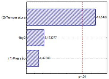 Após a realização da análise dos resultados do planejamento experimental obtidos a partir da avaliação da estimativa dos efeitos calculados (Tabela 2), da análise de variância (Tabela 3), da superfície resposta (Figura 3) e do gráfico de pareto (Figura 4), verificou-se também a interação entre a pressão e a temperatura, sendo possível observar que quando a temperatura é reduzida, a RA aumenta, justificando que a mesma apresentou influência significativa na recuperação de atividade. No gráfico de Pareto (Figura 4), os efeitos dos fatores sobre uma determinada variável, estimados a partir dos dados experimentais, são ordenados de forma decrescente da sua magnitude.