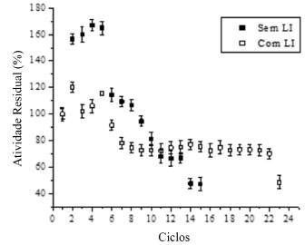 ![]() Figura 5. Teste de estabilidade operacional por batelada para lipase BC imobilizadas por encapsulação em matrizes hidrofóbicas aerogel na ausência e presença de LIP na reação de hidrólise do azeite de oliva com reciclos realizados a cada 30 minutos à 37 ºC