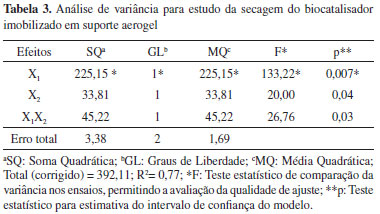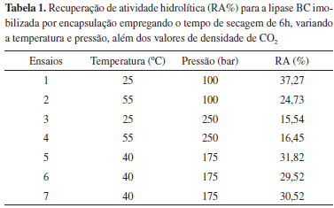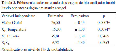 O perfil dos resultados obtidos está de acordo com o descrito na literatura em que é relatado um comportamento diferenciado entre a secagem tradicional com evaporação e a secagem por fluido supercrítico para os biocatalisadores imobilizados.7,9-11 De acordo com os resultados descritos por Soares et al.,19 há uma variação na recuperação de atividade de lipases de Candida rugosa (LCR) na hidrólise do azeite de oliva de 52% para 100% com a variação da pressão ambiente para 120 bar e o tempo de secagem de 10 para 15 h da extração de água por fluido supercrítico. Segundo Kharrat et al.,26 os aerogéis proporcionam uma maior estabilidade da enzima devido a sua porosidade, o que protege a conformação tridimensional da lipase Rizhopus oryzae imobilizada por adsorção física e o local ativo, de qualquer distorção ou alterações estruturais que podem afetar a sua atividade catalítica. Contudo, podemos verificar que para a lipase BC imobilizada pela técnica sol-gel o tempo de secagem influencia na recuperação da atividade. Por fim, para cada caso de formação de aerogel não se pode afirmar que a metodologia proporciona a melhor estabilidade da enzima devido à sua porosidade sem considerar o tempo de extração e outros parâmetros como, por exemplo, a pressão e a temperatura. Planejamento experimental empregando o melhor tempo de secagem Após a seleção do melhor tempo de secagem (6 h) para a obtenção do aerogel, na qual se obteve a melhor recuperação de atividade da lipase BC encapsulada em matrizes obtidas pela técnica sol-gel, foi verificado que os teores de umidade obtidos foram similares àqueles observados quando foi utilizado o método tradicional por evaporação realizada em 72 horas de secagem para a obtenção do xerogel quando comparadas com lipases imobilizadas com a mesma metodologia.5,6,27 Na segunda etapa deste estudo foram avaliadas as condições de temperatura (X1) e pressão (X2) de acordo com o delineamento experimental apresentado na Tabela 1, com a finalidade de determinar as melhores condições de secagem do sol-gel empregando dióxido de carbono pressurizado. Os valores descodificados foram: temperaturas de 25 a 55 ºC e pressões de 100 a 250 bar. Para o sistema estudado, o sinal (+) representa o maior nível de temperatura ou pressão, o sinal (-) refere-se ao menor nível das mesmas variáveis e (0) o ponto médio destas. A matriz experimental e os resultados da atividade hidrolítica dos biocatalisadores são mostrados na Tabela 1. É possível observar nesta tabela que a maior recuperação de atividade como variável dependente na avaliação do processo de secagem foi obtida pelo biocatalisador imobilizado nos menores níveis das variáveis independentes, isto é, na menor temperatura (25 ºC) e pressão (100 bar). As recuperações de atividade (RA%) nos ensaios com maior temperatura (55 ºC) apresentaram desempenho inferior quando comparados aos ensaios com menores temperaturas, cujos valores de RA decaíram de 37,27% para 15,54% (Tabela 1). A Tabela 2 reúne os dados de análise dos efeitos, estimativa de erro padrão e o valor de p (teste estatístico para estimativa do intervalo de confiança do modelo). Os valores de p indicam que somente a temperatura (X1) apresentou influência significativa, enquanto o efeito da pressão (X2) não apresentou um efeito significativo ao nível de 99% de confiança. Estes resultados sugerem que a recuperação de atividade depende significativamente da temperatura e possui menor influência da pressão no estudo de secagem do biocatalisador imobilizado por encapsulação em matriz sol-gel conforme descrito na estimativa dos efeitos calculados na Tabela 2.