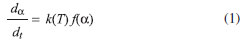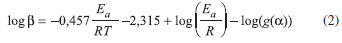 Em que α representa a fator de conversão da amostra, t o tempo para a conversão, T a temperatura absoluta, k(T) a constante cinética em função da temperatura e f(α) a função que representa o modelo de decomposição térmica para o processo em estudo. A constante cinética da reação obedece à Equação de Arrhenius. Em processos não isotérmicos, em que um sólido é submetido a uma razão de aquecimento (β), β=dT/dt, com a utilização da aproximação de Doyle,22 chega-se à expressão: