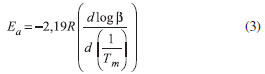 O método de Ozawa permite obter os parâmetros cinéticos da reação.21 Neste, o logaritmo da razão de aquecimento é colocado em função do inverso da temperatura máxima do pico de transição. Portanto, para um processo em que uma amostra é submetida a aquecimento controlado, sob uma determinada razão de aquecimento "β", a inclinação da reta obtida para log β νs 1/T é igual a -0,457Ea/R, onde T é a temperatura relativa à altura máxima da curva termoanalítica (Tm). Assim, calcula-se a energia de ativação (Ea) pela equação 3: