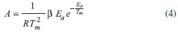 Assim, obtendo-se as respectivas curvas termoanalíticas em diferentes razões de aquecimento, determina-se a Ea do processo construindo-se o gráfico do logaritmo da razão de aquecimento (β) em função do inverso da temperatura de pico (1/Tm). Este procedimento pode ser empregado tanto para curvas obtidas pela termogravimetria (TGA), quanto para as obtidas por calorimetria exploratória diferencial (DSC).24
