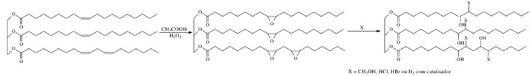 Esquema 1. Representação esquemática do triglicerídeo de óleo de soja, das reações de epoxidação, abertura do anel epóxido e formação do poliol