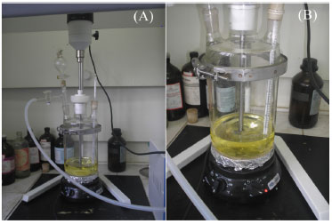 ![]() Figura 1. (A) Reator montado acoplado a bomba de vácuo, sistema de agitação mecânica e funil para dosagem de TDI, (B) síntese do pré-polímero no reator