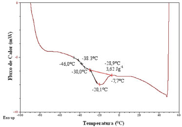 ![]() Figura 2. Curva DSC de amostra do PU-CTDIB1 empregada para determinação da Tg do material nas seguintes condições: massa inicial de 11,197 mg, atmosfera inerte de N2 (50 mL min-1) e razão de aquecimento de 10 K min-1