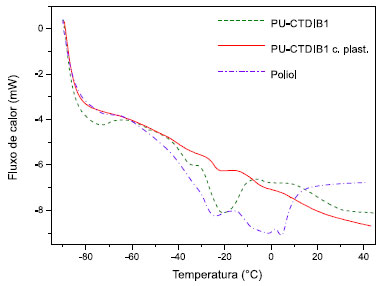 ![]() Figura 3. Curvas DSC de amostras do PU's produzidos PU-CTDIB1 sem adição de plastificante (traço longo), com adição (linha contínua) e do poliol utilizado como matéria prima (traço longo/curto). Nas seguintes condições: massa inicial de 11,197 mg, atmosfera inerte de N2 (50 mL min-1) e razão de aquecimento de 10 K min-1