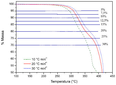 ![]() Figura 4. Curvas TGA da amostra do PU-CTDIB1 mostrando os % de conversão em massa "α" utilizada para o estudo cinético do material. Condições análise: Massa inicial de 10 mg, atmosfera de ar sintético (100 mL min-1), nas seguintes razões de aquecimento: 10,0 ºC min-1, 20 ºC min-1 e 30 ºC min-1