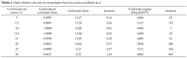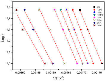 Foram coletados dados de porcentagem de conversão em função da (β), nos níveis conversionais (α) de 5,0%; 7,5%; 10,0%; 12,5%; 15,0%; 20,0%; 25,0% e 30,0% (Figura 4). Traçaram-se então as curvas de Logaritmo de (α) em função de 1/T para os níveis fixos de decomposição térmica. Foram feitos os cálculos para a determinação dos valores de Ea e A, utilizando-se a norma ASTM E1641-07. A Figura 5 apresenta as retas de interpolação linear dos pontos escolhidos de α. A Tabela 3 mostra os valores dos coeficientes: correlação da reta, linear e angular obtido.
