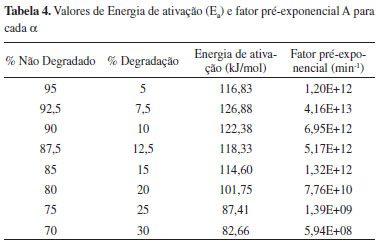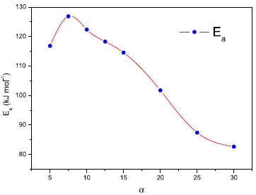 Foram calculados os valores de Ea e A para cada α, conforme mostrado na Tabela 4. Para α igual a 10%, foi obtido um valor de Ea igual a 122,4 kJ mol-1, e de A igual a 6,95x1012 min-1. Esses valores estão muito próximos aos apresentados para a matriz polimérica baseada no PBLH.28 Com isso, foi traçado o gráfico de Ea em função de α (Figura 6), o que permite verificar o valor máximo de Ea necessário à reação.