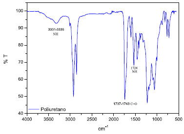 Caracterização de materiais por espectroscopia FT-IR A técnica de espectroscopia no infravermelho com transformada de Fourier (FT-IR) foi empregada para a caracterização do polímero final curado. Esta técnica é comumente utilizada na caracterização de polióis e polímeros como os poliuretanos.29 Para a amostra do polímero formado após a extensão da cadeia com 1,4-butanodiol, observam-se, no espectro da Figura 7, as principais bandas esperadas para um poliuretano, com os valores médios de 3330 cm-1 (estiramento de grupos NH), de 1724 cm-1 (estiramento de amida I de grupos C=O), e de 1538 cm-1 (deformação de amida II de grupos NH).