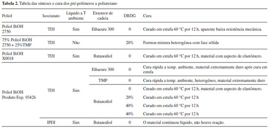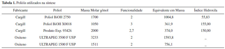 A adição da quantidade de TDI necessária para a reação, previamente calculada, foi feita lentamente, durante 30 minutos, sob agitação mecânica constante e temperatura de 60 ºC, correspondendo à primeira etapa da reação para extensão da cadeia do diol. O meio reacional foi mantido a 60 ºC sob agitação constante durante 60 minutos adicionais. Em seguida, o pré-polímero obtido foi resfriado à temperatura ambiente. Foram realizadas as sínteses dos pré-polímeros com os polióis da Cargill e Oxiteno, conforme apresentado na Tabela 1.