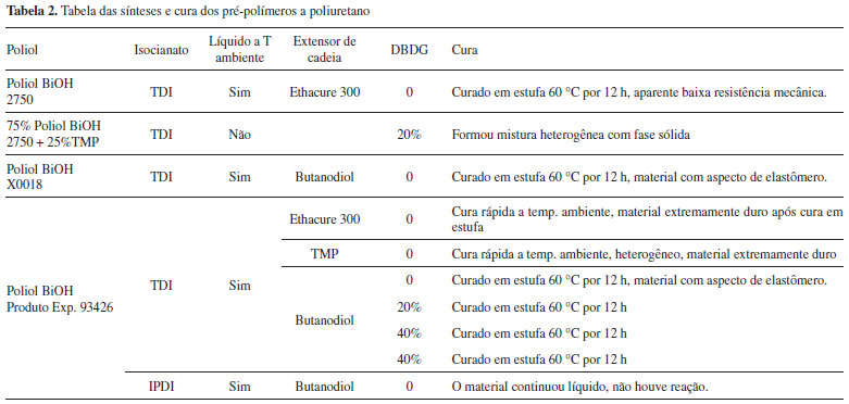 Após a síntese de cada amostra, o pré-polímero obtido foi deixado esfriar à temperatura ambiente. Como o pré-polímero necessita ser líquido na temperatura ambiente para possibilitar a mistura dos componentes utilizados durante o carregamento, este foi o primeiro critério para a seleção do pré-polímero obtido. Quando o mesmo se solidificava, tornava-se necessário o reaquecimento e fusão à temperatura de 60 ºC, com dosagens (m/m) de plastificante "DBDG" e posterior resfriamento. Caso a solidificação persistisse, o pré-polímero era descartado. Fechou-se a cadeia do pré-polímero obtido com um agente extensor de cadeia. Foram inicialmente testados três tipos: um amínico (Ethacure 300) e dois polióis (butanodiol e TMP), porém, somente o butanodiol apresentou bons resultados, pois para o Ethacure 300 o tempo de reação foi muito rápido e as amostras se apresentaram com excesso de dureza. Passou-se então a utilizar o butanodiol como extensor de cadeia. Foram feitas diversas tentativas de síntese de pré-polímeros de todas as amostras de polióis, comercializadas pela Cargill, obtidas com TDI e conseguinte extensão de cadeia com butanodiol. A síntese que se mostrou mais promissora foi com a utilização do poliol Cargill Produto Exp. 93426 + TDI + Butano-1,4-diol, obtendo-se o poliuretano denominado PU-CTDIB1. Na Tabela 2 estão apresentados os processos de síntese, cura e adição de aditivos dos polímeros formulados.