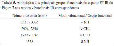 A Tabela 5 mostra as atribuições dos principais grupos funcionais do poliuretano (PU-CTBIB1) obtido aos correspondentes modos vibracionais IR.