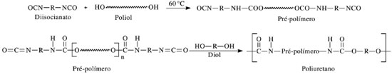 Esquema 2. Representação esquemática das reações de síntese do pré-polímero e da obtenção de poliuretano e através da cura com um diol