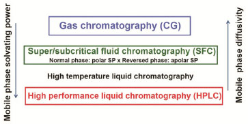 ![]() Figure 1. Schematic description of the three main types of chromatography based in the nature of mobile phase: gas chromatography, liquid chromatography and super/subcritical chromatograph. Adapted from reference 14