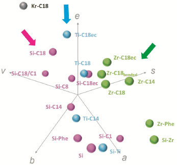 Figure 4 shows an example of a spider diagram applied to the characterization of 19 SP based on silica and on silica modified with zirconia and titania, having polysiloxanes with different chain lengths (C1, C8, C14 and C18, phenyl) thermally immobilized onto these supports, as well as a commercial chemically bonded SP, Kromasil C18.108 The chemically bonded SP Kromasil C18 (Kr-C18) is positioned very far from the other SP, at the top left of the figure where non-polar phases usually are situated. Among the SP, the least polar phases, with large e and v values, are situated in the upper part of the diagram while the most polar phases, with large a and b values are at the bottom right. The latter are the supports without polymer coatings (Si; Si-Ti; Si-Zr) and the phases with phenyl (Zr-Phe; Si-Phe) or short chain (methyl) ligands (Si-C1). Comparing the positions of the SP confirms the initial information on the similarity of chromatographic behavior between these phases. When replacing one SP by another one with a close position in the figure, small changes of selectivity can be observed.108 The use of the spider diagram allows selecting specific regions where a given column is more suitable for a particular application based on the properties of these SP. The SP shown in Figure 4 are distributed as follows: more or less polar, more or less retentive, having higher selectivity or better peak symmetry for basic compounds, etc.,108 proving that pSFC is an interesting and powerful tool to perform the characterization of different types of SP, and can be used to select a stationary phase according to its chromatographic behavior for a specific application.
