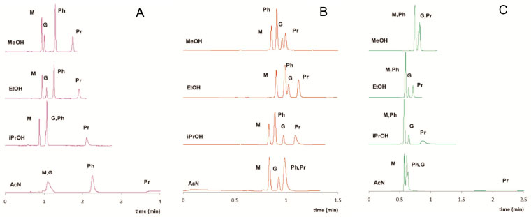 Figure 5. Chromatograms of four barbiturates on cyanopropyl-bonded silica (A), phenyl-oxypropyl-bonded silica (B) and pentafluorophenyl-propyl-bonded silica (C) as function of the MP modifier. Solutes: M mephobarbital; Ph phenobarbital; G glutethimide; Pris primidone. Chromatographic conditions: CO2--modifier 90:10 (v/v), 25 ºC, 150 bar, 3 mL min-1 and UV detection 210 nm. Adapted from reference 36
