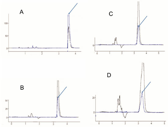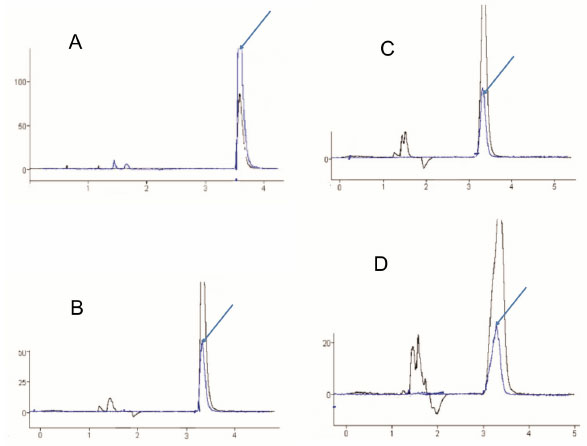 Figure 6. UV (210 nm) and ELSD chromatograms (3 bar for the nebulizer gas:N2; drift temperature: 40 ºC ) obtained for different injected volumes of caffeine: (A) 5µl (500 ppm); (B) 10 µl (100 ppm); (C) 15 µl (50 ppm) and (D) 20 µl (25 ppm). The ELSD chromatograms were slightly shifted on the left side of the UV chromatogram to provide a better view of the right side of the peak width difference between the UV and the ELSD chromatograms. Conditions: CO2-methanol, 90:10 (v/v), 25 ºC, outlet pressure: 150 bar, 3 mL min-1. The arrows indicate the ELSD peaks. Adapted from reference 121