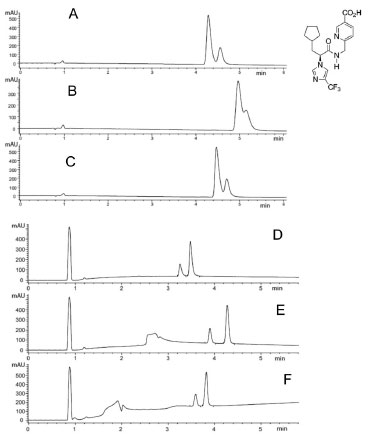![]() Figure 7. Separation of a chiral amide on a Chiralcel OD-H column in A, B and C and a Chiralcel IC column in D, E and F. (A,D) methanol; (B,E) methanol with 0.1% of isopropylamine (IPA); (C,F) methanol:ACN (75:25, v/v) with 0.1% of trifluoroacetic acid (TFA) and 0.1% IPA. Chromatographic conditions: Modifier from 5 to 50% gradient at 6.5%/min, hold for 1 min; 40 ºC, outlet pressure: 150 bar, 4 mL min-1; UV detection at 254 nm. Adapted from reference 123