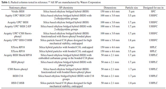Considering all these reasons prep-SFC is a valuable tool, and in some cases complementary to prep-HPLC, for isolating the different compounds of a mixture, as in the case of producing functional food ingredients; it is frequently used for the fractionation and purification of extracts obtained with SFE. An example is the extraction of pesticides as reported by Rissato et al.112 In the literature, applications of prep-SFC can be found in the analysis and purification of foods, pharmaceuticals compounds, natural products, etc.3,110 Ultra high performance SFC In recent years, major instrumental improvements have led to the introduction of an ultra-high performance supercritical fluid chromatograph (UHPSFC), developed by the Waters Corporation63,113 and commercialized with the name Ultra-Performance Convergence ChromatographyTM (UPC2). This equipment has been optimized specifically for SFC and presents very low void space volumes and improved detection with flow cell, pump modules and back pressure regulator, including the reliability and precision of the pumping system and backpressure regulation, required for controlling the delivery of mixtures of CO2 and the organic modifier and its additives.113 These improvements give the separation some interesting advantages such as increases in throughput and in the efficiency of the analyses, especially when used in combination with sub 2-µm particles. However, since the introduction of this equipment is very recent (2012), its actual performance in routine analysis has yet to be confirmed.63,114,115 Dr. Davy Guillarme, one of the first users of UHPSFC, discussed the applicability of the equipment in the separation of neutral, acidic and basic compounds.114,115 According to this researcher, neutral and acidic compounds are not problematic and can be analyzed under SFC/UHPSFC conditions using almost any mobile or stationary phase. On the other hand, basic compounds are problematic and deserve special attention. This may be due to the fact that the mobile phase of SFC (and UHPSFC) has an acidic pH (about 5) related to the transient formation of methylcarbonic acid originating from the reaction of methanol and CO2 when this modifier is present. To improve the peak shape of basic drugs, particularly those with a pKa higher than 8, it is necessary to change the nature of the stationary phase and work preferentially with a column bonded with a basic group, such as ethylpyridine. On the other hand, it is also possible to change the character of the MP by using other additives (e.g., 20 mmol/L ammonium hydroxide) in the mobile phase.114,115 Perrenoud et al.,116 in one of the first publications using UHPSFC, compared the performance, possibilities and limitations of both ultra-high performance liquid chromatography (UHPLC) and ultra-high performance supercritical fluid chromatography (UHPSFC) using columns packed with sub-2 mm particles for the separation of free steroids, benzodiazepines and other pharmaceutical compounds, as shown in Table 1. The results proved the compatibility of these sub-2 µm SP, especially recommended for UHPSFC, for use in the gradient mode, showing results similar to or better than those using UHPLC. In terms of column chemistry this paper tested the performance of different stationary phases for SFC such as bare silica, hybrid silica and silica with ethylpyridine groups (Table 1). The results demonstrated that changes in selectivity are more significant using UHPSFC conditions, when compared with UHPLC conditions, due to the nature of the stationary phase bonding and also the absence of water in the MP, which affects the interaction mechanisms between analytes and the SP. In the same paper, various types of column chemistries with 1.7 mm particles were evaluated for both UHPLC and UHPSFC conditions using a mixture of acidic, neutral and basic compounds. The results showed that more drastic changes in selectivity were obtained using UHPSFC phases, compared to those obtained by changing the UHPLC SP. In addition, there was a good complementarily between the two separation modes. When using small particles in UHPSFC, it was also possible to realize analyses of pharmaceutical compounds in less than 1 minute or to obtain peak capacities of more than 250 in approximately 40 min, both with a high degree of repeatability.116