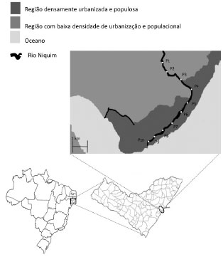 ![]() Figura 1. Pontos de coleta de amostras de água superficial e sedimentos no Rio Niquim. Localização Geográfica dos Pontos de amostragem: P1- 9º49'30.91"S 35º53'41.08"O, P2- 9º49'42.11"S 35º53'40.47"O, P3- 9º49'48.63"S 35º53'28.47"O, P4- 9º49'55.81"S 35º53'19.88"O, P5- 9º50'2.41"S 35º53'16.32"O, P6- 9º50'8.84"S 35º53'18.98"O, P7-9º50'15.08"S 35º53'24.00"O, P8- 9º50'21.73"S 35º53'32.80"O, P9- 9º50'26.80"S 35º53'39.94"O, P10- 9º50'32.79"S 35º53'47.16"O