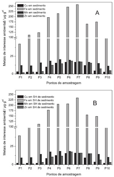 ![]() Figura 2. Teores de metais (Cu, Fe, Mn e Zn) nos sedimentos (A) e nas substâncias húmicas (B) de sedimentos coletados na Bacia Hidrográfica do Rio Niquim-AL