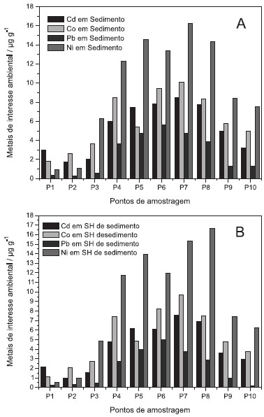![]() Figura 3. Teores de metais (Cd, Co, Pb e Ni) presentes nos sedimentos (A) e nas substâncias húmicas (B) de sedimentos coletados na Bacia Hidrográfica do Rio Niquim-AL