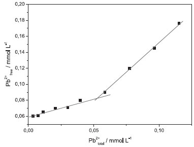![]() Figura 4. Curva para determinação da capacidade complexante de SH de sedimentos por ions Pb2+ utilizando o sistema de ultrafiltração em fluxo tangencial