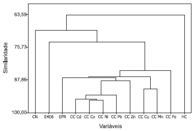 ![]() Figura 5. Dendograma obtido pela análise estatística multivariada AHA das características das substâncias húmicas de sedimentos (C/N, H/C, E4/E6 e EPR) e capacidades complexantes (CC)