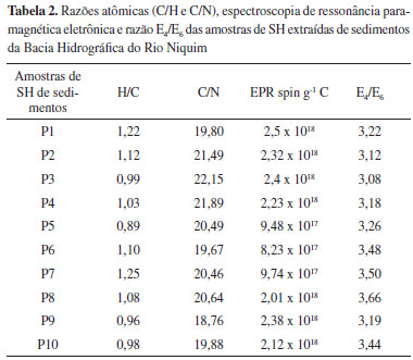 De acordo com as análises físico-químicas, o pH variou de 5,3 a 6,2 nas amostras de águas superficiais analisadas e a demanda bioquímica de oxigênio (DBO) apresentou uma variação de 4,32 a 10,73 mg L-1. De acordo com Gomes et al.,23 a DBO refere-se à quantidade de oxigênio necessária para oxidar a matéria orgânica presente nos corpos d'água pela decomposição microbiana aeróbia. Elevados valores de DBO em um corpo d'água são geralmente causados pelo lançamento de cargas orgânicas, principalmente esgotos domésticos. Segundo a resolução CONAMA 357/2005, para rios de classe 2 o máximo permitido para DBO deverá ser de 5,00 mg L-1. Nos resultados obtidos, observa-se um aumento dos valores de DBO nos pontos P4, P5 e P6. Esses pontos recebem aporte de esgotos domésticos da população que vive em seu entorno, justificando o aumento da DBO. Elevados valores de DBO acarretam uma diminuição dos valores de OD na água, podendo ocasionar a mortandade de peixes e eliminação de outros organismos aquáticos.23 Os teores de OD nas amostras de águas superficiais variaram de 5,24 a 10,50 mg L-1, sendo menores para os pontos com elevados valores de DBO, evidenciando o impacto pelo lançamento de carga orgânica, originária principalmente por esgotos domésticos. A Resolução CONAMA 357/05, que trata da qualidade dos corpos hídricos superficiais, referencia o valor mínimo permitido de 5 mg L-1 para mananciais de classe 2. Assim, apesar da elevada carga orgânica lançada nos pontos de coleta analisados, a BHRN apresenta níveis de OD que não afetam a vida aquática. Os teores de cloreto variaram entre 3,2 a 18,5 mg L-1 (Tabela 1), sendo os valores superiores determinados nos pontos de amostragem P4, P5 e P6, pontos que recebem aporte de contaminantes residenciais. Sodré et al.24 sugerem que concentrações de cloretos em águas são comumente utilizadas como indicativo de lançamento de esgoto bruto em águas tropicais, e elevadas concentrações de cloreto são conseqüência da presença na urina humana lançada diretamente no ambiente aquático.24,7 Com relação ao teor de carbono orgânico total (COT), seus valores estão compreendidos entre 7,80 a 8,89 mg L-1, tendo alguns rios como rio Negro (AM) o teor de COT de 15 mg L-1 e o Rio Itapanhaú (SP) de 12,3 mg L-1, cujos resultados estão na dependência da vazão do Rio, do clima, da vegetação, da atividade microbiológica e das estações do ano.18 Sedimentos e substâncias húmicas de sedimentos As substâncias húmicas presentes nos sedimentos exercem papel fundamental na retenção de espécies potencialmente tóxicas. Em rios, agem principalmente como complexantes, não permitindo que essas espécies fiquem biodisponíveis para o ambiente aquático.1,2 As características das substâncias húmicas extraídas dos sedimentos fornecem informações importantes quanto o grau de humificação dessas SH. Recentes estudos tem demonstrado a correlação direta existente o grau de humificação das SH e complexação de metais.12,25,26 A razão C/N é indicativa do grau de decomposição da matéria orgânica, isto é, quanto maior a razão C/N, há diminuição na quantidade de nitrogênio presente nas substâncias não húmicas, indicando que houve degradação do material e, consequentemente, aumento na formação das substâncias húmicas. Os valores das razões C/N para as amostras de SH de sedimentos estão entre 19,7 e 22,6, indicando pouca diferença quanto à decomposição das SH de sedimentos (Tabela 2). A literatura apresenta valores de razão C/N para sedimentos no intervalo de 9,09-12,5, indicando que as amostras neste estudo possuem maior grau de humificação.27