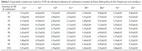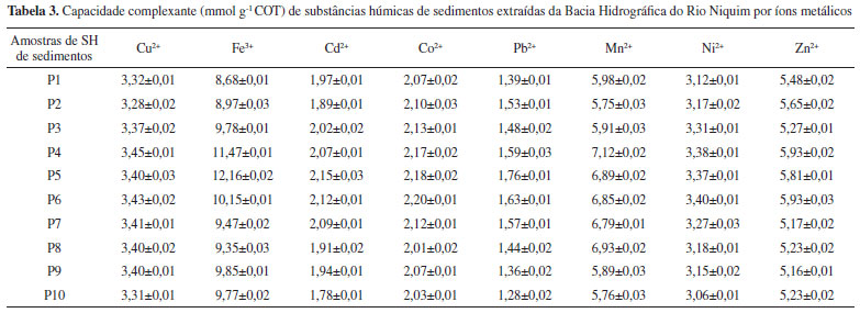 A CC das SH de sedimentos por íons metálicos (Tabela 3) reflete sobre a máxima afinidade dos sítios ligantes das SH pelas espécies metálicas, responsáveis pela biodisponibilidade dessas espécies para o ambiente.