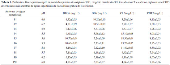 RESULTADOS E DISCUSSÃO Águas superficiais As caracterizações das águas superficiais podem fornecer informações quanto à ação de possíveis descartes de contaminantes de origem antrópica na qualidade dessas águas. A Tabela 1 apresenta os resultados obtidos dos parâmetros pH, DBO, OD, Cl- e COT.