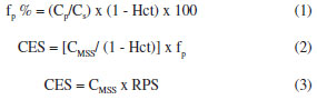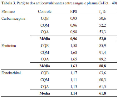 O conhecimento da partição plasma/sangue total dos anticonvulsivantes é importante para permitir a estimativa de concentrações séricas a partir daquelas mensuradas em MSS, com o emprego de fatores de multiplicação apropriados.14 Os valores médios de RSP foram 0,96; 1,14 e 1,63 para CBZ, FNB e FNT, respectivamente (Tabela 3). Também, a partir das concentrações obtidas em sangue total e plasma no estudo de partição, foram calculadas as fp %, que foram estimadas como 52,0; 61,8 e 88,8 para CBZ, FNB e FNT, respectivamente (Tabela 3).