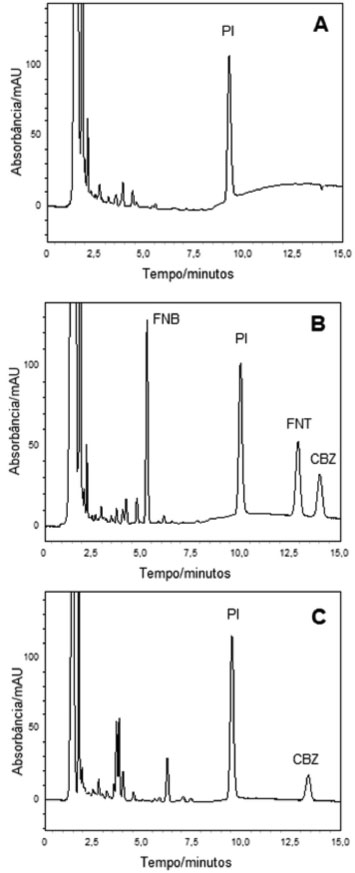 ![]() Figura 1. Cromatogramas obtidos a partir de MSS, monitorados em 205 nm. Tempos de retenção de 5,2 min para FNB, 10,4 min para PI (propranolol), 13,0 min para FNT e 14,0 min para CBZ. A: MSS isento dos fármacos. B: MSS contendo FNB e FNT 25 µg mL-1 e CBZ 10 25 µg mL-1. C: MSS de paciente contendo CBZ 5,52 µg mL-1