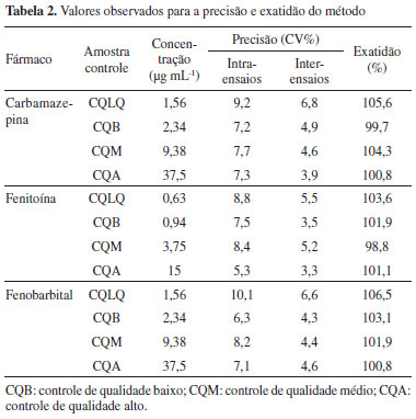 PARTE EXPERIMENTAL Reagentes, materiais e amostras de referência CBZ e FNT foram adquiridas da Alpha Aesar (Ward Hill, Estados Unidos). Fenobarbital (FNB) foi obtido do Laboratório Cristália (Itapira, Brasil). Propranolol foi adquirido da Purifarma Química e Farmacêutica (São Paulo, Brasil). Metanol e acetonitrila (grau HPLC), ácido fosfórico 85%, fosfato de potássio monobásico e fosfato de potássio dibásico foram adquiridos da Merck (Darmstadt, Alemanha). Papel Whatman 903 foi adquirido da GE Healthcare (Westborough, Estados Unidos). Preparação das soluções e dos padrões Soluções estoque individuais dos fármacos foram preparadas a partir da sua dissolução em metanol a fim de obter uma concentração de 10 mg mL-1 para FNT e FNB e de 1 mg mL-1 para CBZ. A solução de trabalho combinada foi preparada pela adição de alíquotas das soluções estoque de cada anticonvulsivante e ajuste do volume final com metanol para obter concentrações de 500 µg mL-1 para FNT e FNB e 200 µg mL-1 para CBZ. A solução estoque de propranolol foi preparada na concentração de 1 mg mL-1 em metanol. A solução de trabalho do padrão interno (PI) (propranolol 1 µg mL-1) foi preparada através da dissolução da solução estoque com metanol. A mistura de extração foi composta de acetonitrila e metanol (1:3, v/v). Equipamentos e condições cromatográficas As análises foram realizadas em um sistema de cromatografia líquida de alta eficiência Accela 600, composto de sistema de bombeamento quaternário, autoamostrador e detector de arranjo de diodos. O sistema de cromatografia foi controlado pelo programa ChromQuest 5.0 (Thermo Scientific, EUA). A separação cromatográfica foi realizada em uma coluna Hypersil Gold C18, também proveniente da Thermo Scientific, com 15 cm de comprimento, 4,6 mm de diâmetro interno e contendo partículas com 3 µm de diâmetro. A fase móvel foi uma mistura de tampão fosfato 25 mM pH 6,2, acetonitrila e metanol (73:18:9, v/v), eluída a uma vazão de 0,9 mL min-1. O tampão foi filtrado em membrana de acetato de celulose com poros de 0,45 µm de diâmetro (Sartorius, Alemanha) antes da preparação da fase móvel. A fase móvel foi sonicada por 20 min antes da sua utilização. A coluna foi mantida a 52 ºC durante a análise. Os cromatogramas foram monitorados em 205 nm, com aquisição de espectros de varredura entre 200 e 380 nm. A duração da análise cromatográfica foi de 17 min. Preparação das amostras Discos de MSS foram obtidos por meio da perfuração dos cartões Whatman 903 com um perfurador com punção de 8 mm de diâmetro (equivalente a 20 µL de sangue total), sendo utilizado um disco por extração. O disco foi transferido para microtubo de polipropileno, ao qual foi adicionado 250 µL da mistura de extração e 50 µL da solução de trabalho de padrão interno. A mistura foi homogeneizada em homogeneizador rotativo por 30 minutos a 100 RPM, em temperatura ambiente. Após, o sobrenadante foi transferido para outro microtubo de polipropileno e evaporado até a secura a 55 ºC, sob fluxo de ar. O extrato seco foi retomado com 200 µL da fase móvel, seguido de centrifugação a 10.000 g por 10 minutos. O sobrenadante foi transferido para um frasco de autoamostrador. Uma alíquota de 25 µL foi injetada na coluna cromatográfica. Seletividade A seletividade foi avaliada por meio da verificação da presença de interferentes nos tempos de retenção dos analitos em MSS obtidas de 6 indivíduos não usuários dos fármacos avaliados neste estudo. Todos os picos presentes nos cromatogramas tiveram seus espectros de varredura no UV comparados com espectros de referência, adquiridos a partir das análises de amostras de referência e armazenadas em uma biblioteca espectral, bem como tiveram sua pureza avaliada pela rotina computacional disponibilizada pelo programa ChromQuest 5.0. Linearidade A linearidade dos modelos de calibração foi avaliada em seis níveis, em sextuplicata para cada nível, empregado sangue total com hematócrito % (Hct%) 40 como matriz. Em amostras de sangue total isento dos fármacos de interesse foram adicionadas soluções de trabalho combinadas dos analitos a fim de obter soluções analíticas nas concentrações de 1,56; 3,12; 6,25; 12,5; 25 e 50 µg mL-1 para FNB e FNT e 0,625; 1,25; 2,5; 5; 10 e 20 µg mL-1 para CBZ. O sangue foi aplicado ao papel Whatman 903 e seco em temperatura ambiente por 3 h para obtenção das MSS. As curvas analíticas foram construídas calculando as razões entre as áreas dos picos de cada analito e do padrão interno e comparando estas razões com as concentrações nominais dos calibradores. A homocedasticidade dos dados de calibração foi avaliada com o teste F com nível de confiança de 95%. As curvas foram ajustadas a partir da regressão linear empregando diversos fatores ponderais (1/x, 1/x0,5, 1/x2, 1/y, 1/y0,5, 1/y2). Os modelos de calibração foram avaliados pelos coeficientes de correlação (r) e do erro percentual cumulativo (Σ%ER).11 Foi selecionado o modelo de regressão com r superior a 0,99, associado ao menor Σ%ER. Curvas analíticas diárias, usando as mesmas concentrações (medidas únicas por concentração), foram preparadas durante o processamento de todos os lotes analíticos. Precisão e exatidão Foram preparadas amostras de MSS controle para avaliação da precisão e da exatidão em concentração baixa (CQB), média (CQM) e alta (CQA). O CQB conteve FNB, FNT e CBZ nas concentrações de 2,34; 2,34 e 0,94 µg mL-1, respectivamente. O CQM conteve FNB, FNT e CBZ nas concentrações de 9,38; 9,38 e 3,75 µg mL-1, respectivamente. O CQA conteve FNB, FNT e CBZ nas concentrações de 37,5; 37,5 e 15,5 µg mL-1, respectivamente. As análises foram realizadas como descrito anteriormente, em triplicatas, e repetidas em 5 dias diferentes. A precisão intraensaios e a precisão interensaios foram calculadas pela análise de variância (ANOVA), usa