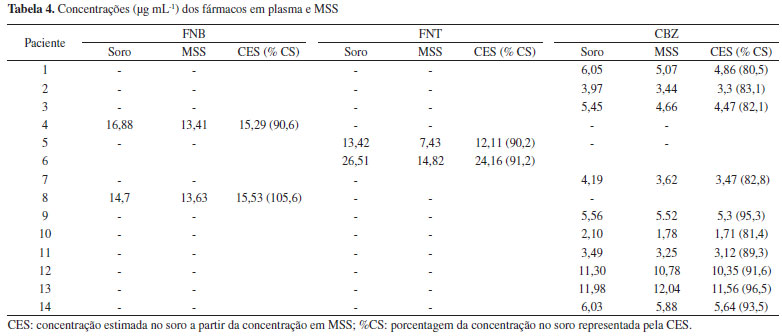 Aplicação do método Um total de 14 amostras pareadas de plasma e MSS foram obtidas e analisadas (Tabela 4). As concentrações obtidas em soro e em MSS apresentaram proporcionalidade, com razões soro/MSS médias de 1,11 (faixa de 0,99 a 1,22) para CBZ, 1,17 (faixa de 1,09 a 1,23) para FNB e 1,80 para FNT. Enquanto as razões soro/MSS determinadas para FNB foram semelhantes as RPS determinadas in vitro, os valores das razões soro/MSS para CBZ e FNT foram aproximadamente 10% superiores às RPS. Estas diferenças podem ser parcialmente atribuídas a diferenças no %Hct entre os pacientes e o sangue empregado no experimento in vitro, especialmente considerando que a maior parte dos pacientes foi composta por crianças que normalmente apresentam valores de %Hct aumentados. As concentrações séricas foram estimadas através da Equação 3, considerando que o %Hct individual dos pacientes não estava disponível. Utilizando esta abordagem, as concentrações séricas estimadas a partir das concentrações em MSS estiveram na faixa entre 80,5 a 96,5% para CBZ; 90,6 a 105,6% para FNB e 90,6 a 91,2% para FNT.