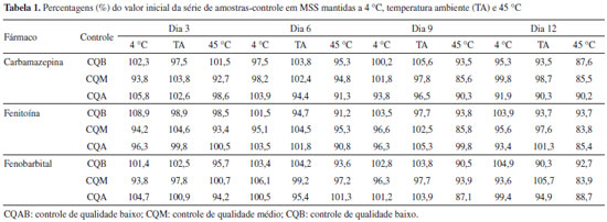 A técnica utilizada para o preparo das amostras foi relativamente simples, com a utilização de discos de 8 mm de MSS, acrescentados de 250 µL do solvente de extração e 50 µL do PI, seguidos de homogeneização, centrifugação e evaporação da fase orgânica. Shah et al. empregaram uma etapa semelhante de extração líquido-líquido, a qual foi seguida de retomada do extrato em água e posterior extração em fase sólida, com nova evaporação da fase orgânica antes da injeção no sistema de CLAE.10 A abordagem utilizada neste estudo, mais simples e rápida, permitiu a obtenção de sensibilidade e seletividade suficientes para a aplicação clínica do método. Validação do método Não houve indicação de instabilidade dos analitos quando as MSS foram mantidas em temperatura ambiente ou 4 ºC durante 12 dias, com variações de concentração dos analitos entre 93,5 e 108,9% dos valores iniciais da série (Tabela 1). Entretanto, na temperatura de 45 ºC foi identificada uma tendência de redução nas concentrações determinadas nas amostras controle, com valores aceitáveis, na faixa de 85,8 a 99,8% até o dia 9, sendo que diversas amostras controle apresentaram valores inferiores a 85% da concentração inicial da série no dia 12, demonstrando instabilidade. Assim, MSS contendo os analitos avaliados neste estudo não requerem condições especiais de conservação, permitindo seu transporte e armazenamento em embalagens não refrigeradas, expostas a temperaturas de até 45 ºC, por até 9 dias, o que é compatível com o transporte postal.
