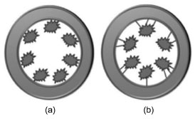 Independente da natureza do suporte, a classificação pode ser realizada levando em consideração também a sua morfologia e porosidade, apresentando-se como fator importante devido à possibilidade de imobilização da enzima na sua superfície e/ou no seu interior, sem afetar a estabilidade estrutural da enzima.18,78,92 Segundo a IUPAC (Internacional Union of Pure and Applied Chemistry), os materiais porosos são classificados em função do diâmetro como microporoso, mesoporoso ou macroporoso. Suportes microporosos (diâmetro menor que 2 nm) apresentam como vantagem a eliminação da resistência à transferência de massa interna, e podem ser úteis no processo de imobilização de enzimas devido à formação de uma rede ou agregados. Na Figura 4 é possível verificar partículas microporosas isoladas e combinadas.