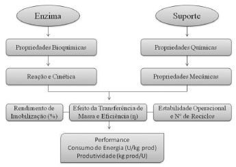 ![]() Figura 3. Fatores que afetam o desempenho de enzimas imobilizadas em suportes sólidos