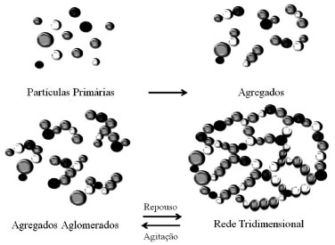 ![]() Figura 4. Esquema representativo de formação de ponte de hidrogênio entre o Aerosil® (a) e aglomeração para formação da rede trimensional (b)