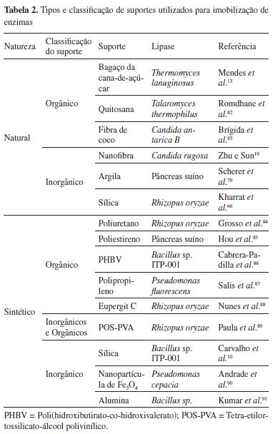 Dentre as caracteristicas citadas acima, a estabilidade mecânica do suporte também é um parâmetro crucial para muitas aplicações de enzimas imobilizadas. A estabilidade mecânica pode limitar o biocatalisador imobilizado ao longo da aplicação, causando o efeito de stress mecânico e desintegração do catalisador durante o processo, influenciando a atividade catalítica, estabilidade de armazenamento, operacional e térmica.53 De acordo com Talbert e Goddard et al.,18 o material utilizado como suporte para a imobilização de enzimas pode modificar a quantidade de água total nas proximidades da enzima e a partição dos reagentes e/ou produtos na mistura reacional. Portanto, o balanço hidrofílico/hidrofóbico da superfície do suporte é fundamental, pois na etapa de preparação de suportes hidrofóbicos a água pode ficar retida nos interstícios porosos e, consequentemente, ao redor da enzima imobilizada. A presença da quantidade mínima de moléculas de água no microambiente é necessária para preservação da estrutura conformacional da enzima. Todavia, o uso de suportes hidrofílicos no processo de imobilização promove a competição da água entre o suporte e a enzima durante a reação, influenciando no equilíbrio termodinâmico do sistema.52 A natureza física do suporte, por exemplo, morfologia, tamanho e distribuição dos poros, influencia também diretamente no rendimento de imobilização e em efeitos difusionais causados pela transferência de massa entre o meio líquido e os biocatalisadores imobilizados. Essas limitações podem ser resumidas em duas fases: transferência de massa externa, que envolve a transferência de reagentes/substratos do meio reacional até a superfície do suporte de imobilização, e a transferência de massa interna, que descreve a transferência de reagentes/substratos no suporte de imobilização até o sítio ativo da enzima. Qualquer etapa da difusão pode limitar a atividade global da enzima imobilizada.5,53,70,81 Ainda se deve considerar o custo-benefício da escolha do suporte de imobilização, pois de acordo com Scherer et al.,79 o preço do suporte utilizado na imobilização de enzimas é um fator a ser analisado, devendo ser comparadas as vantagens e desvantagens da aplicação dos biocatalisadores nos diferentes processos. Conforme a classificação dos suportes quanto à composição, os materiais mais utilizados são os orgânicos, notadamente os polímeros, os quais podem ser naturais ou sintéticos. Os suportes sintéticos exibem variedades de formas físicas e estruturas químicas, podendo ser combinadas para formar um suporte ideal. Os naturais apresentam algumas vantagens quando comparados aos sintéticos, como baixo custo e facilidade de degradação, sem causar danos ao meio ambiente.31,62 Contudo, os suportes inorgânicos, naturais ou sintéticos, são mais apropriados para uso industrial por apresentarem elevada resistência mecânica, estabilidade em ampla faixa de pressões, temperaturas e valores de pH, rigidez, resistência a solventes orgânicos e ao ataque microbiano.1,5,31 Na Tabela 2 são apresentados diferentes suportes para imobilização de lipases e sua classificação.